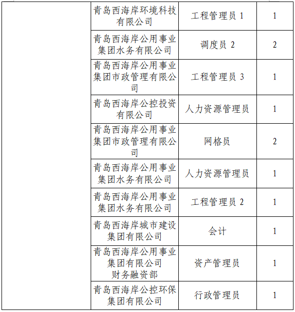 为满足集团业务发展需要,青岛西海岸公用事业集团有限公司现面向社会公开招聘工作人员26名,具体招聘公告如下: